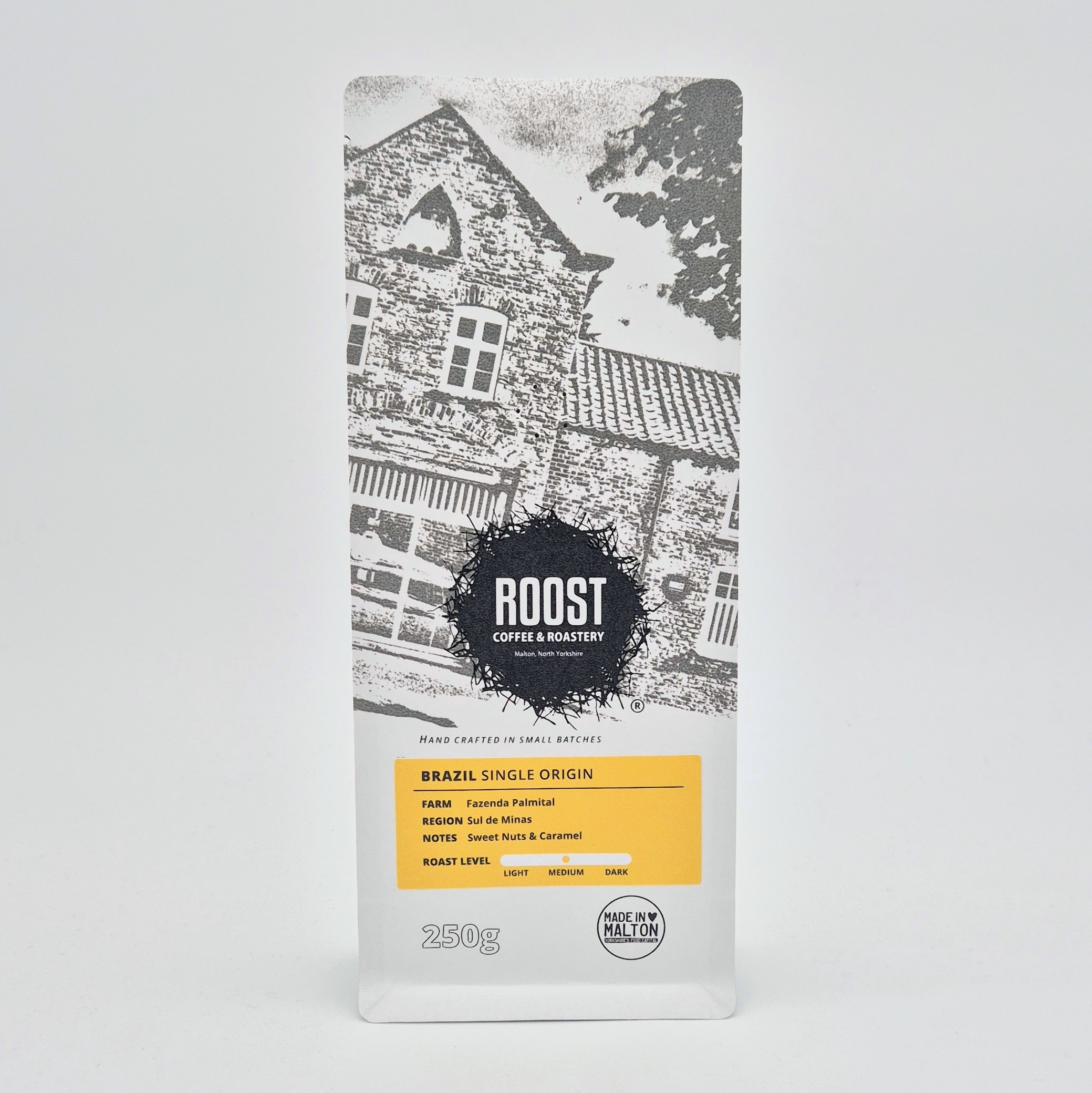 Medium roast. Medium smooth body with a sweet kick.