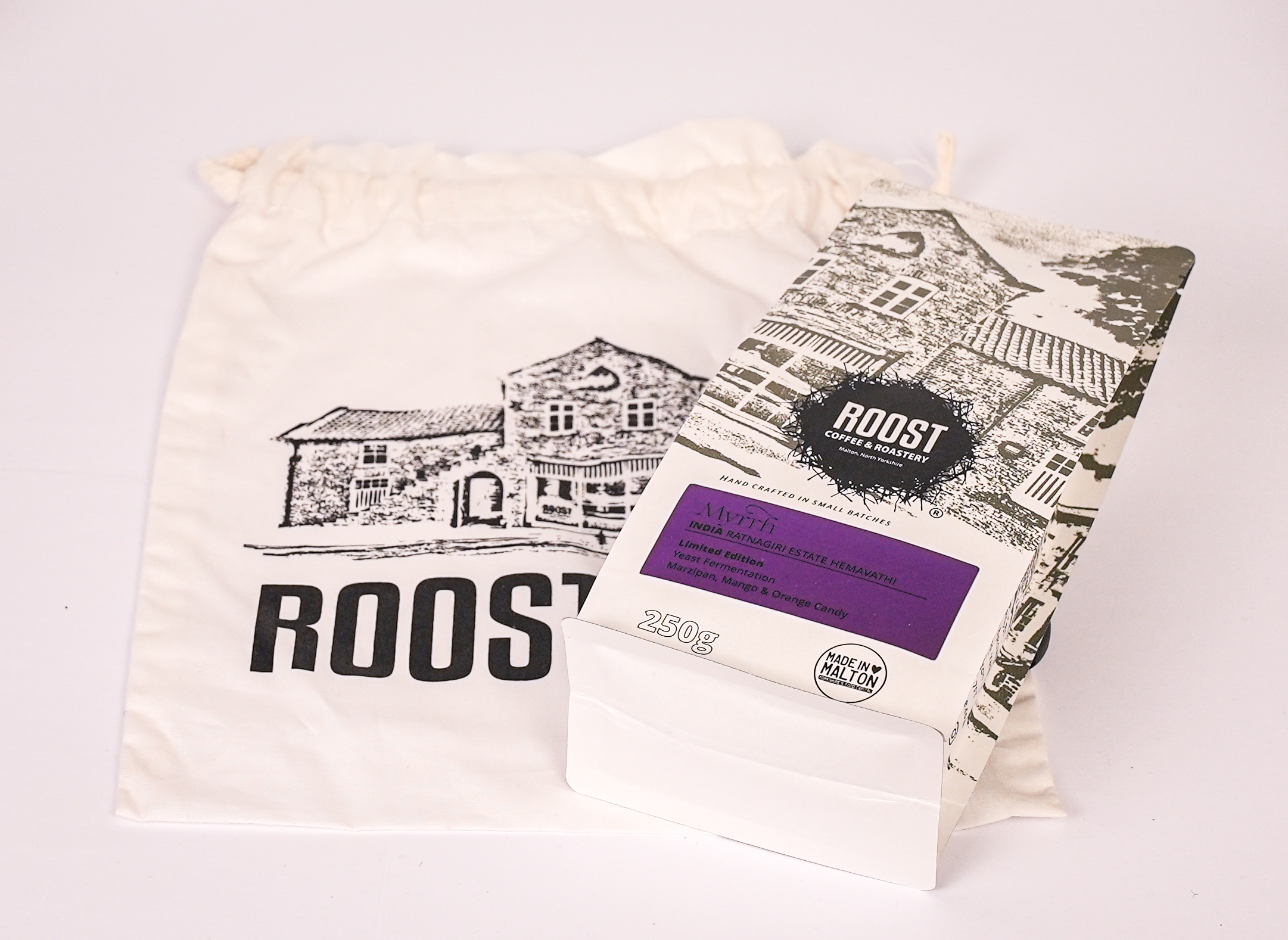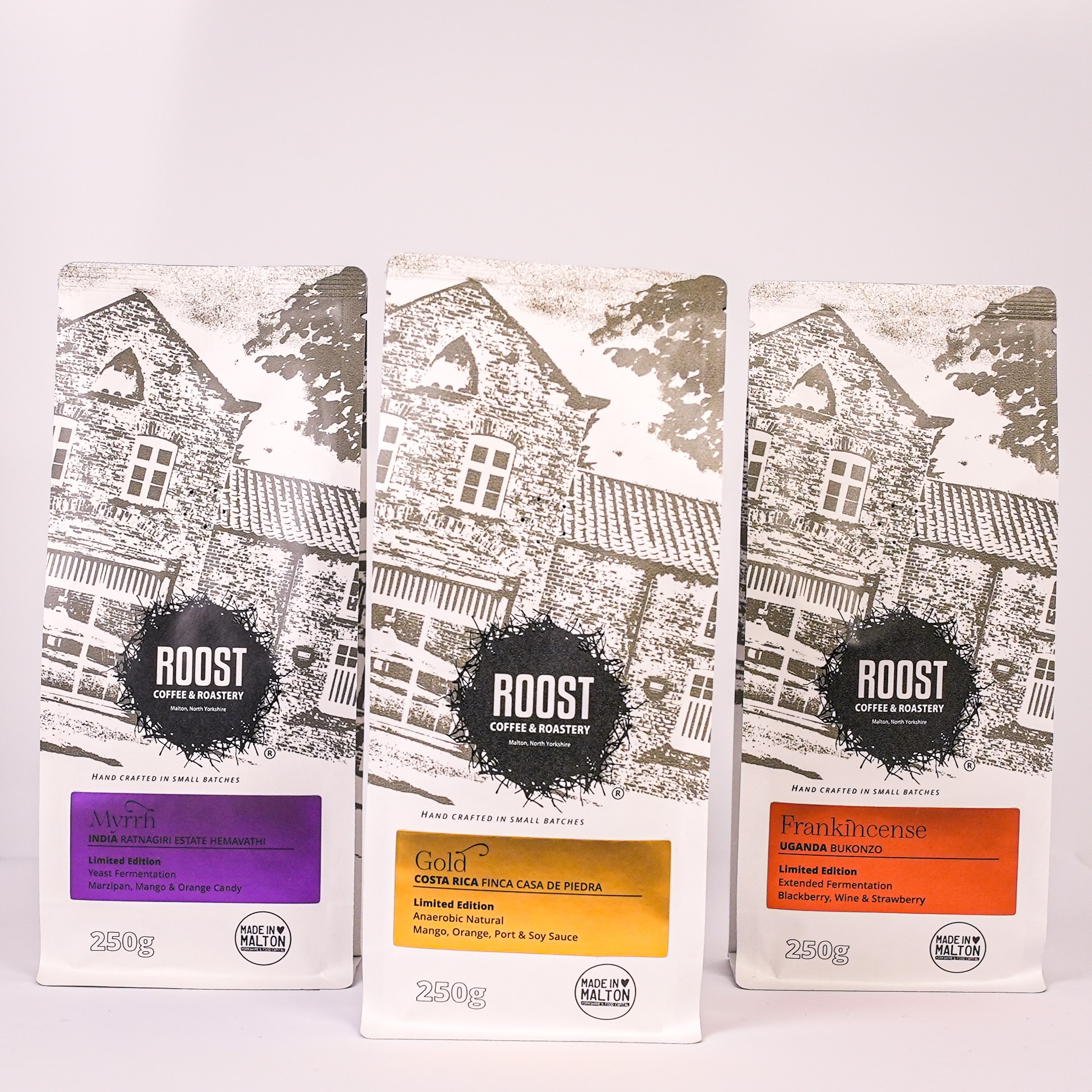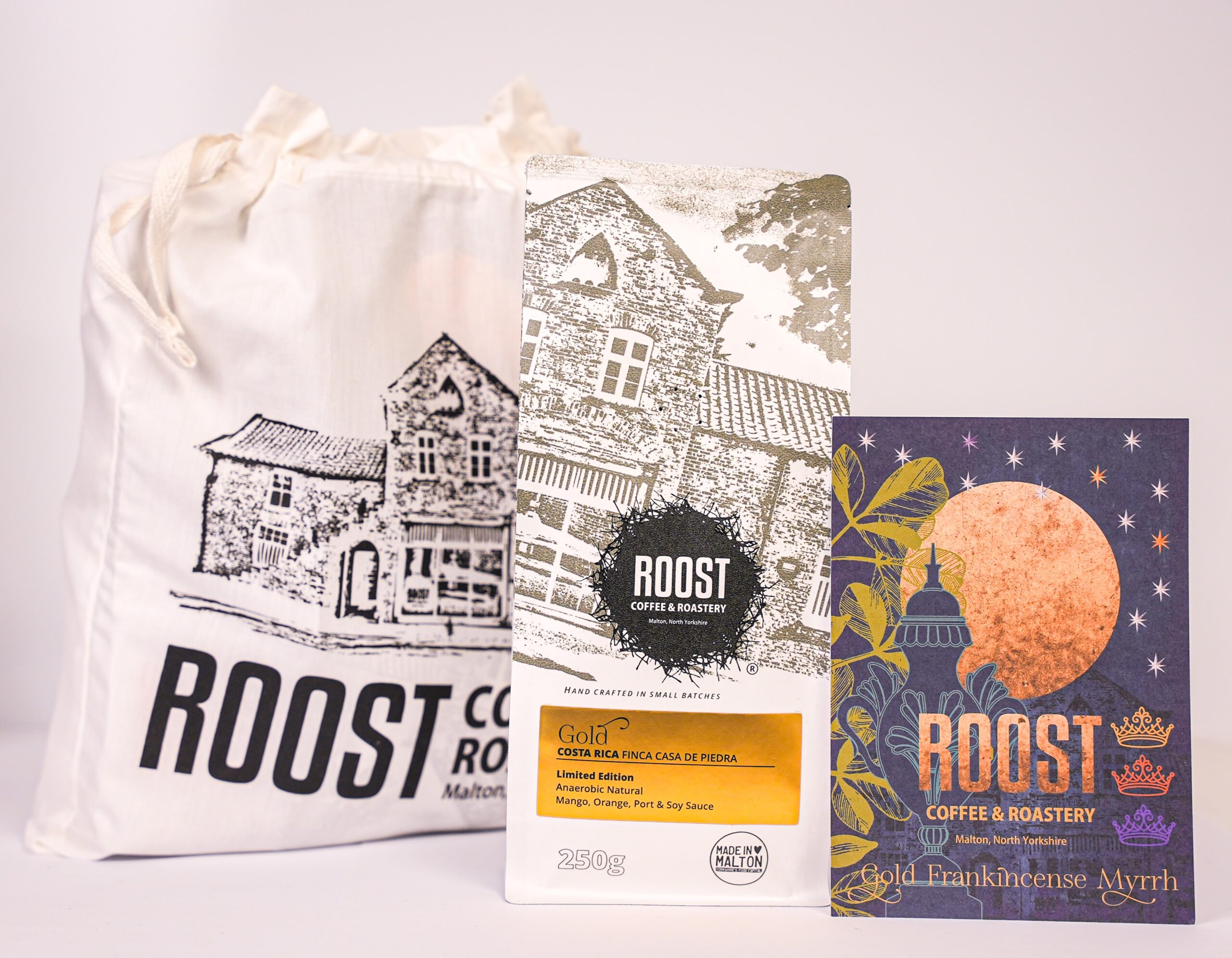 The 3 x 250g Christmas single origin coffees come in a 100% organic cotton bag. There is a card included with more information on each of the 3 coffees, Gold, Frankincense & Myrrh. The labels have a metallic finish for a festive feel. This is a coffee gift fit for a King!